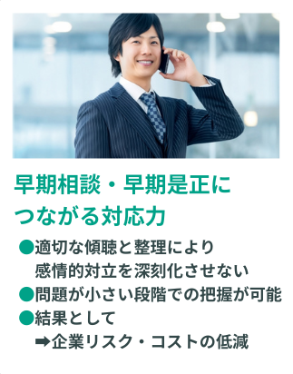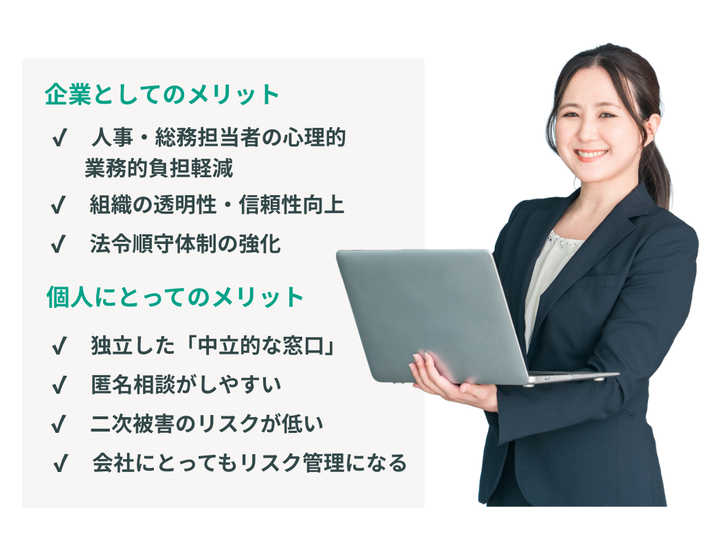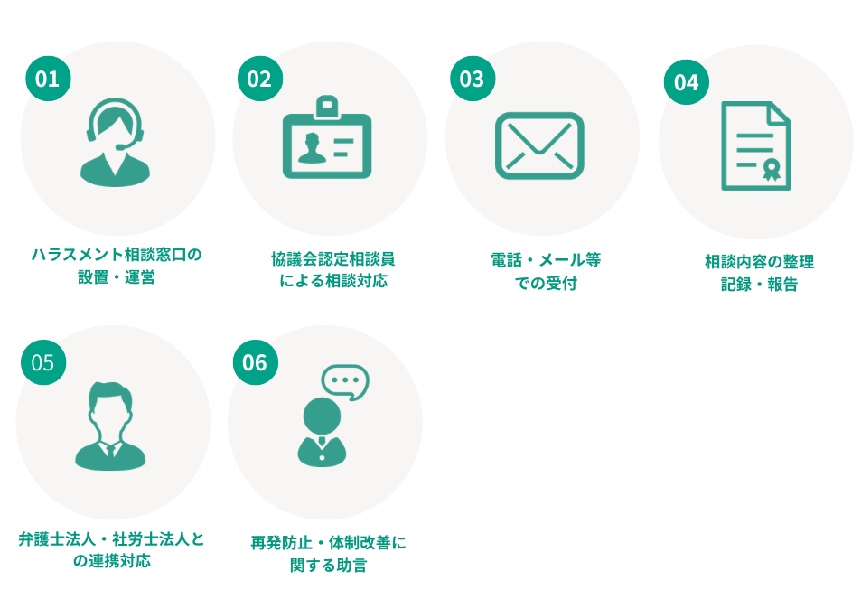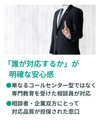 単純な「設置義務対応」にとどまらず、外部専門チームの導入という位置づけとなります。本当に機能する相談窓口を企業に提供いたします。具体t系なサービス内容は以下の通りです。