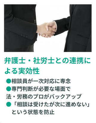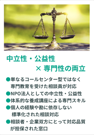協議会独自の相談員養成制度・NPO法人としての中立性・弁護士・社労士との専門連携・企業リスクを最小化する仕組みを組み合わせた、実効性・信頼性・継続性を兼ね備えたモデルです。